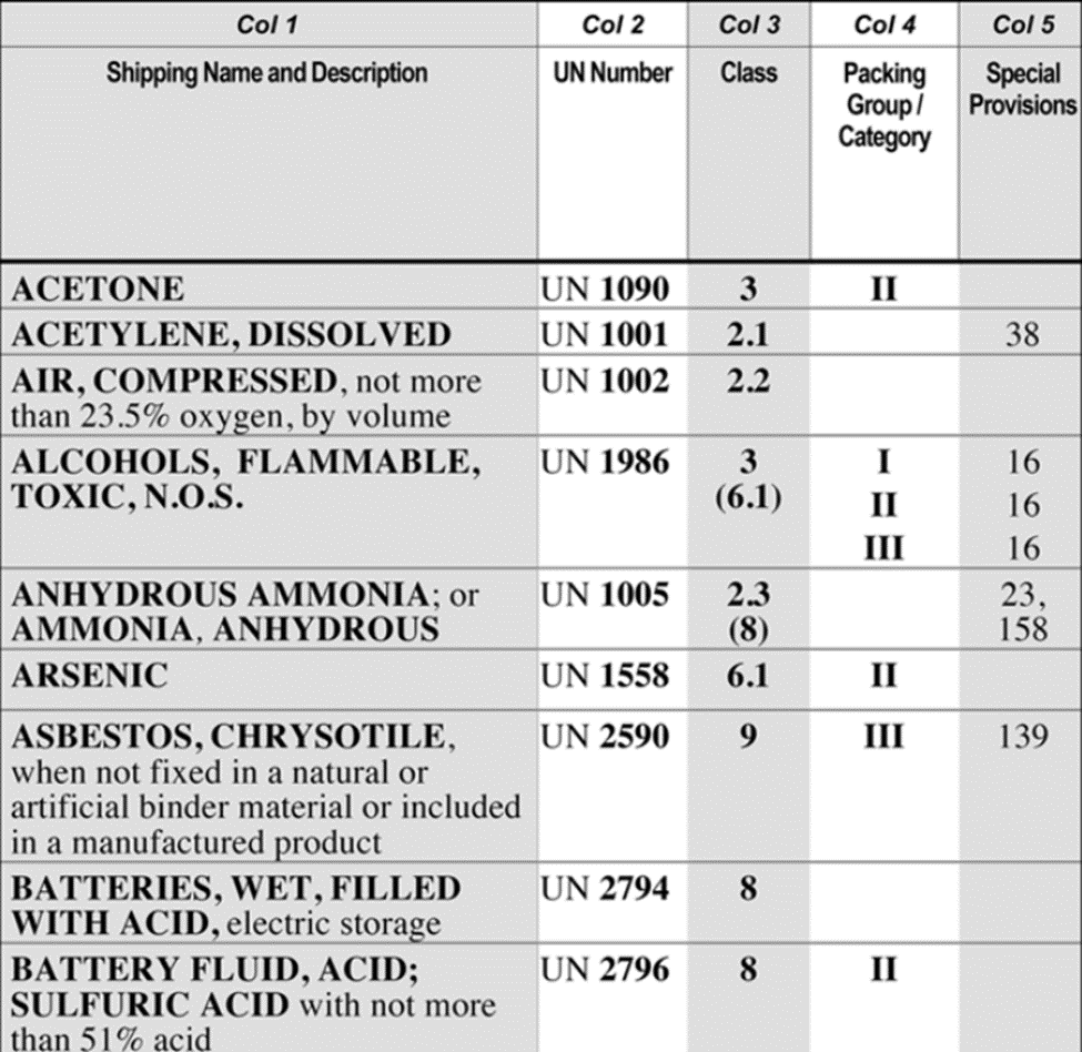 Column 2 – Is used around the world an as an ID number for shipping. Ie. Acetone is UN 1090 around the world even when the word Acetone is different in many language.